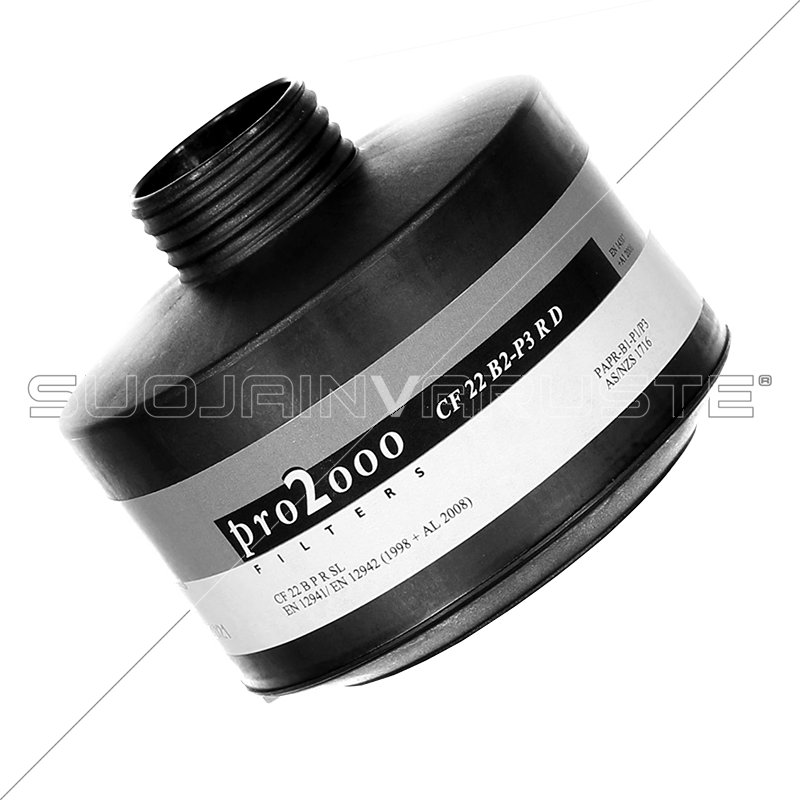 Kaasunsuodatin B2-P3 jossa kaasujen- ja höyryjensuodatusteho on erittäin hyvä, suurikapasiteettisen hiilen ansiosta. Absorboiva pinta-ala on suuri hiilen mikrohuokosten vuoksi. Hyvä absorbointikyky tekee tuotteesta pitkäikäisen. Hiukkassuodatin on kosteudenkestävä ja suodattaa erinomaisesti aerosoleja myös kosteissa ympäristöissä. Suodatinkotelo on valmistettu lasikuituvahvisteisesta muovista. Suodattimien suodatusarvo on erittäin korkea ja hengitysvastus pieni. Suuri ilman sisäänvirtauskanava pienentää ilmanvirtausvastuksen minimiin.