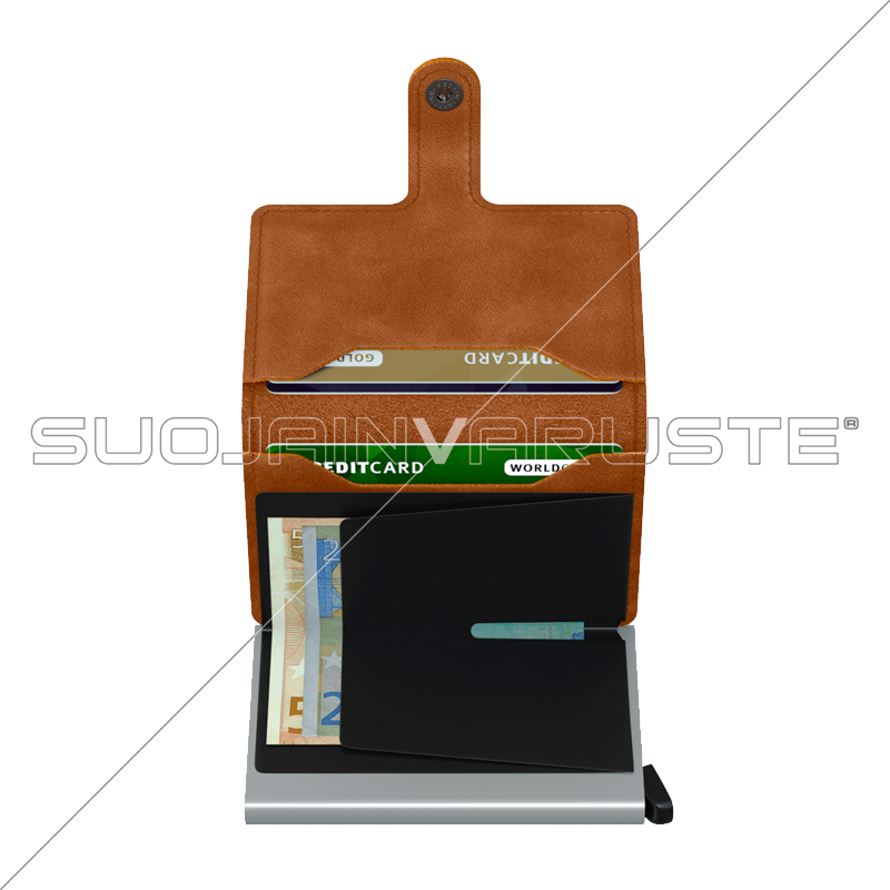 Lompakko-osuus on valmistettu korkealaatuisesta nahasta ja korttikotelo on kestävää ja turvallisuutta lisäävää alumiinia, joka estää luvattoman RFID korttien skannauksen. • Lompakon alumiininen kuori estää luvattoman RFID-skannauksen